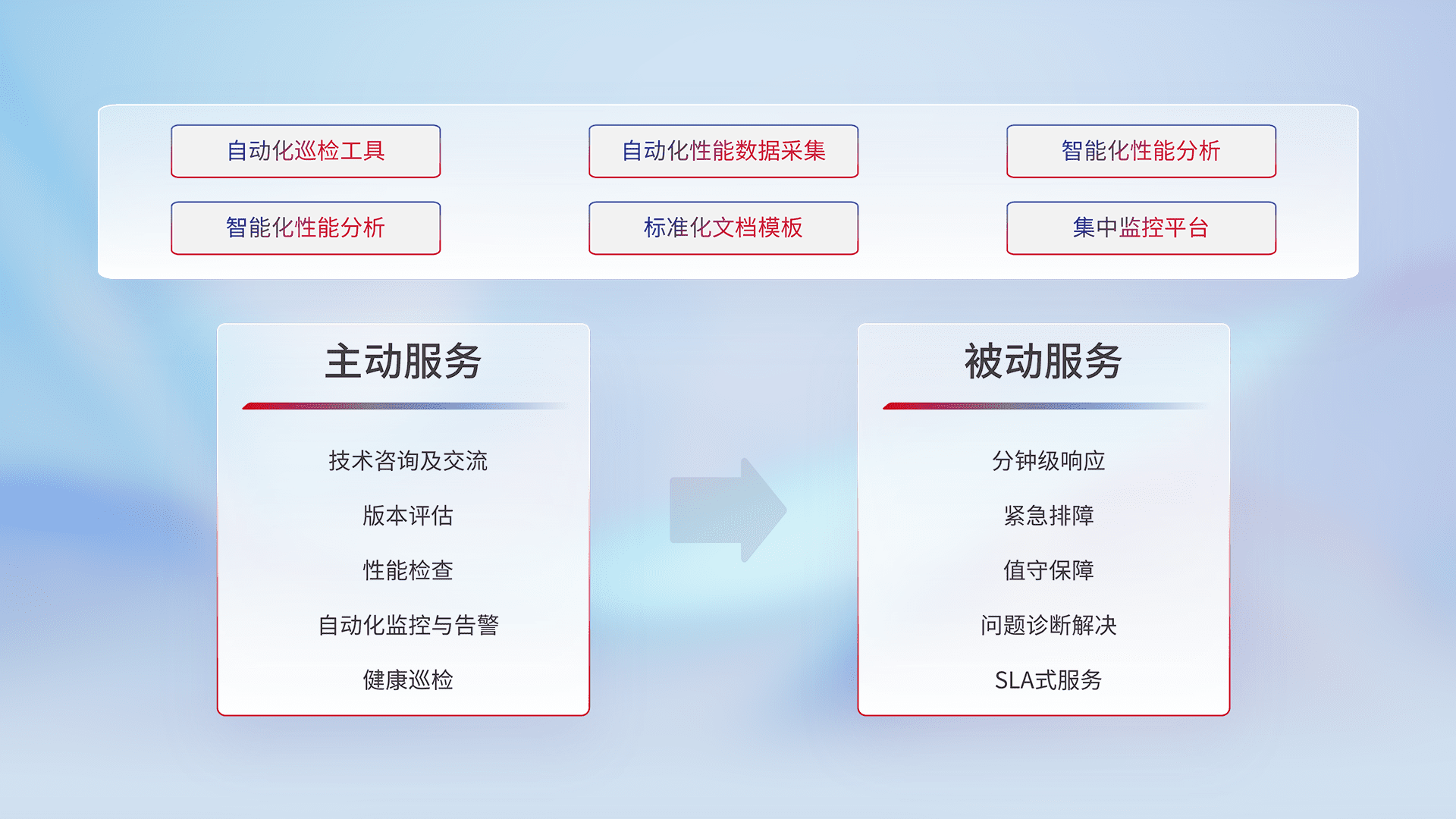 智能化工具和标准化文档,,,保障服务质量,,提供主动服务(包含技术咨询、、、、版本评估、、、性能检查、、、自动化监控与告警、、、健康巡检)和被动服务包含(分钟级响应、、紧急排障、、值守保障、、、、问题诊断解决、、、、SLA服务)。。